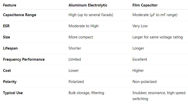 等価直列抵抗 (ESR) も同様に重要です。 ESRが低いほど、電力損失と発熱が少なくなります。アルミニウム電解コンデンサは一般にフィルム コンデンサよりも ESR が高くなりますが、低 ESR タイプを選択すると効率と熱安定性を向上させることができます。